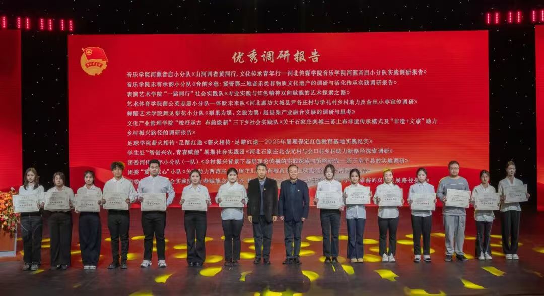 为深入践行习近平总书记关于青年工作的重要思想,持续推动“大思政课”实践化、常态化,引导新传学子在社会实践中坚定理想信念、锤炼过硬本领。12月10日,“追光校园·行走的思政课——河北传媒学院2025年暑期社会实践活动表彰大会”在兴安校区1200平演播厅圆满落幕。我院师生荣获优秀实践小分队、先进个人、优秀调研报告、优秀指导教师、优秀宣传奖、优秀组织奖等多项表彰。其中,新闻传播学院普韵兴“冀”振兴乡村志愿服务队、新闻传播学院“新”欣“乡”荣实践团和新闻传播学院语链未来志愿服务队荣获多项表彰。