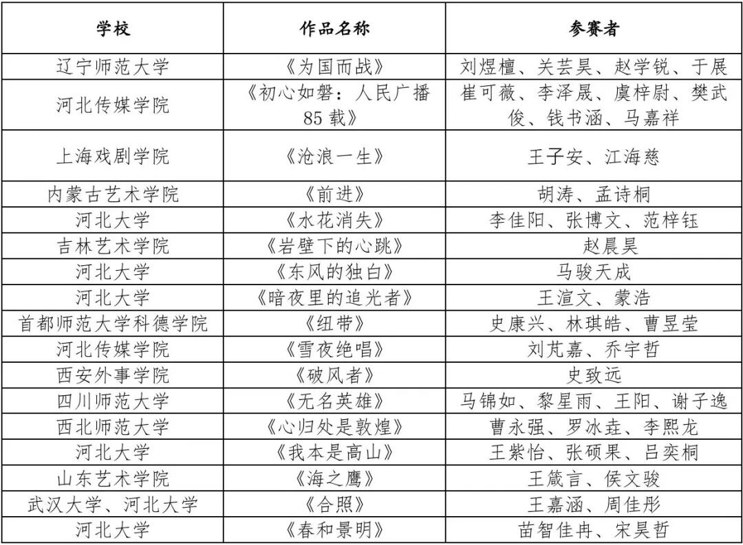 据悉本届大赛共收到包括中国传媒大学、武汉大学、上海戏剧学院、南京艺术学院、浙江传媒大学等在内的全国各地120所高校(省外58所,省内62所)报送的802部作品(省内672部,省外130部),参赛院校覆盖全国23个省(自治区、直辖市)。经过初赛、复赛、决赛评委权威、公正的评判,我院报送的两部作品一路过关斩将双双入围决赛,并最终获得二等奖和三等奖。