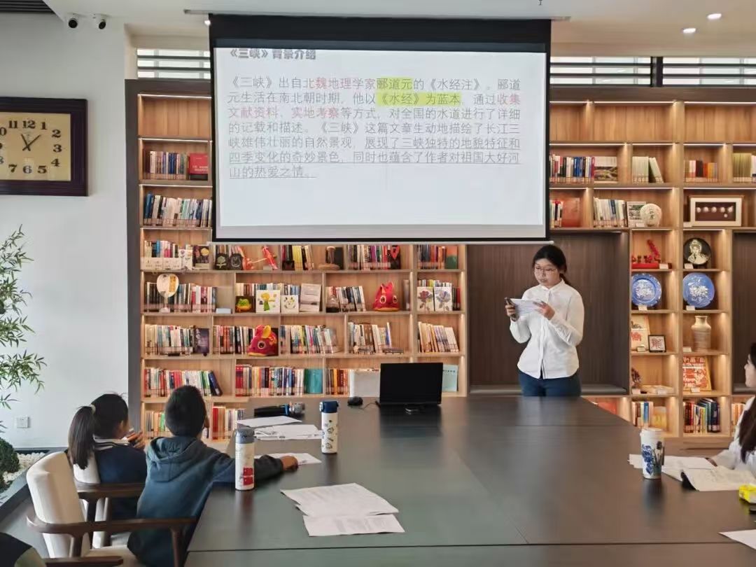 最后,主持人介绍了三峡的创作背景和人物介绍,王艺轩同学对《三峡》原文的朗诵表演,并对《三峡》进行了翻译。