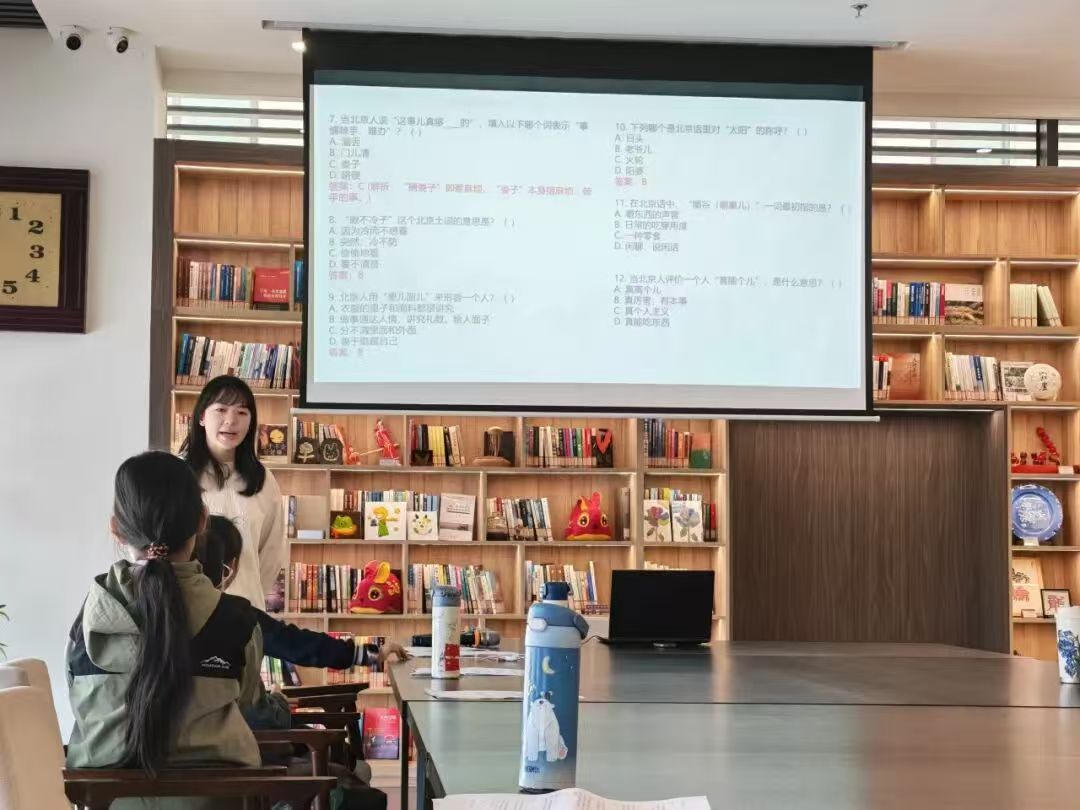 其次,郭金冉同学带领同学们进行知识问答。题目围绕北京方言词汇含义和三峡文化设计。“您受累”是什么意思?“老家儿”又是指的什么?生动展现了北京话的亲切感。还对《三峡》进行了更进一步的分析。