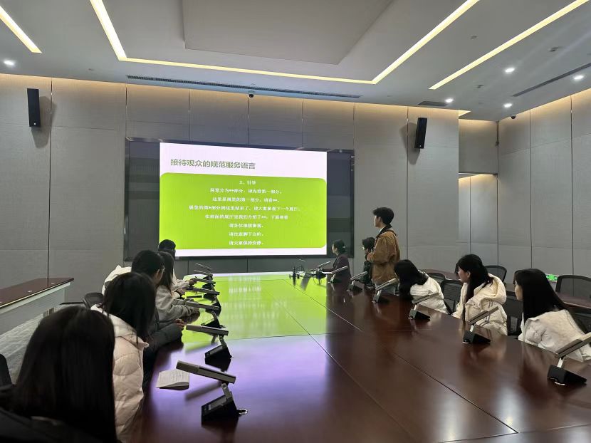 培训的最后一环是自主练习:同学们分组打卡不同展区,试着把刚学到的礼仪和讲解技巧融入实践。