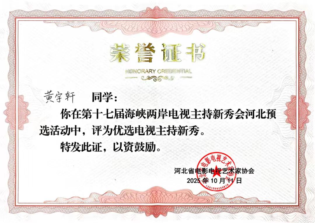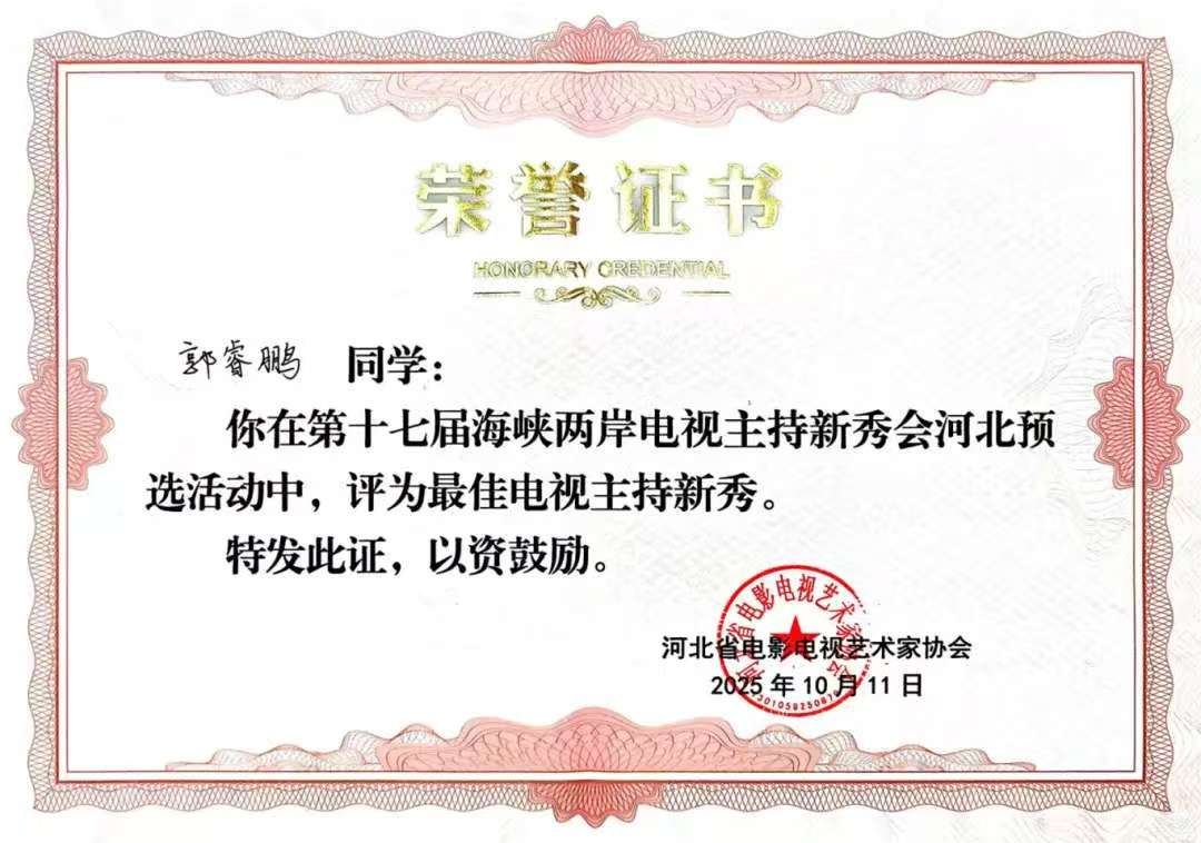据悉,第十七届海峡两岸电视主持新秀会全国赛事将于近期启动,郭睿鹏同学将与各地优胜者同台竞技,进一步展现河北青年主持人才的专业风采。