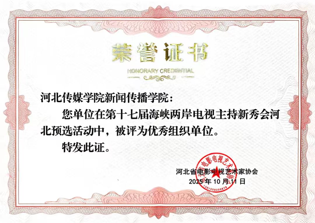 10月11日上午,第十七届海峡两岸电视主持新秀会河北预选赛在河北省文联圆满落幕。来自全省7所高校的代表选手历经多轮专业比拼,河北传媒学院2023级播音与主持艺术专业学生郭睿鹏以总成绩第一斩获“最佳电视主持新秀”称号,将代表河北省赛区出征全国主赛事;黄宇轩获“优选电视主持新秀”称号,河北传媒学院因组织工作突出获评“最佳组织奖”。