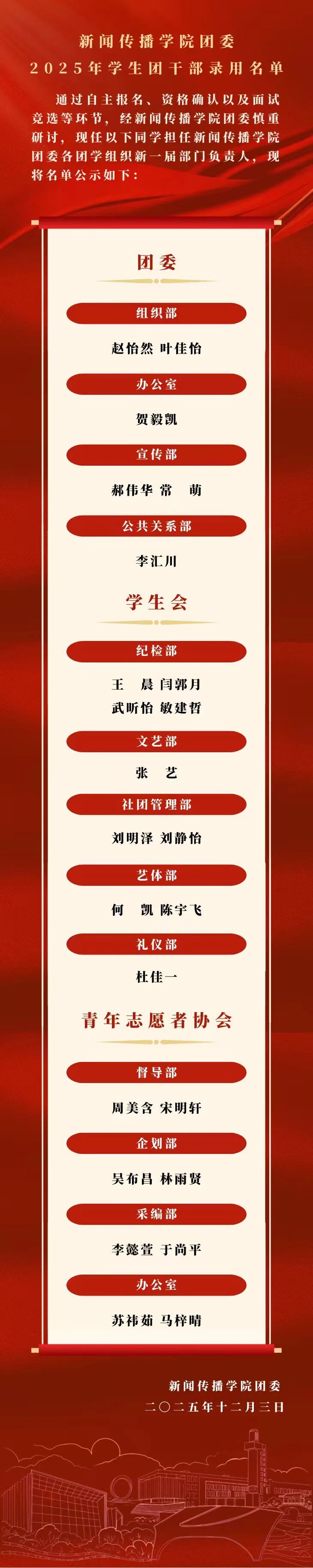 【公示】新闻传播学院团委2025年学生团干部录用名单